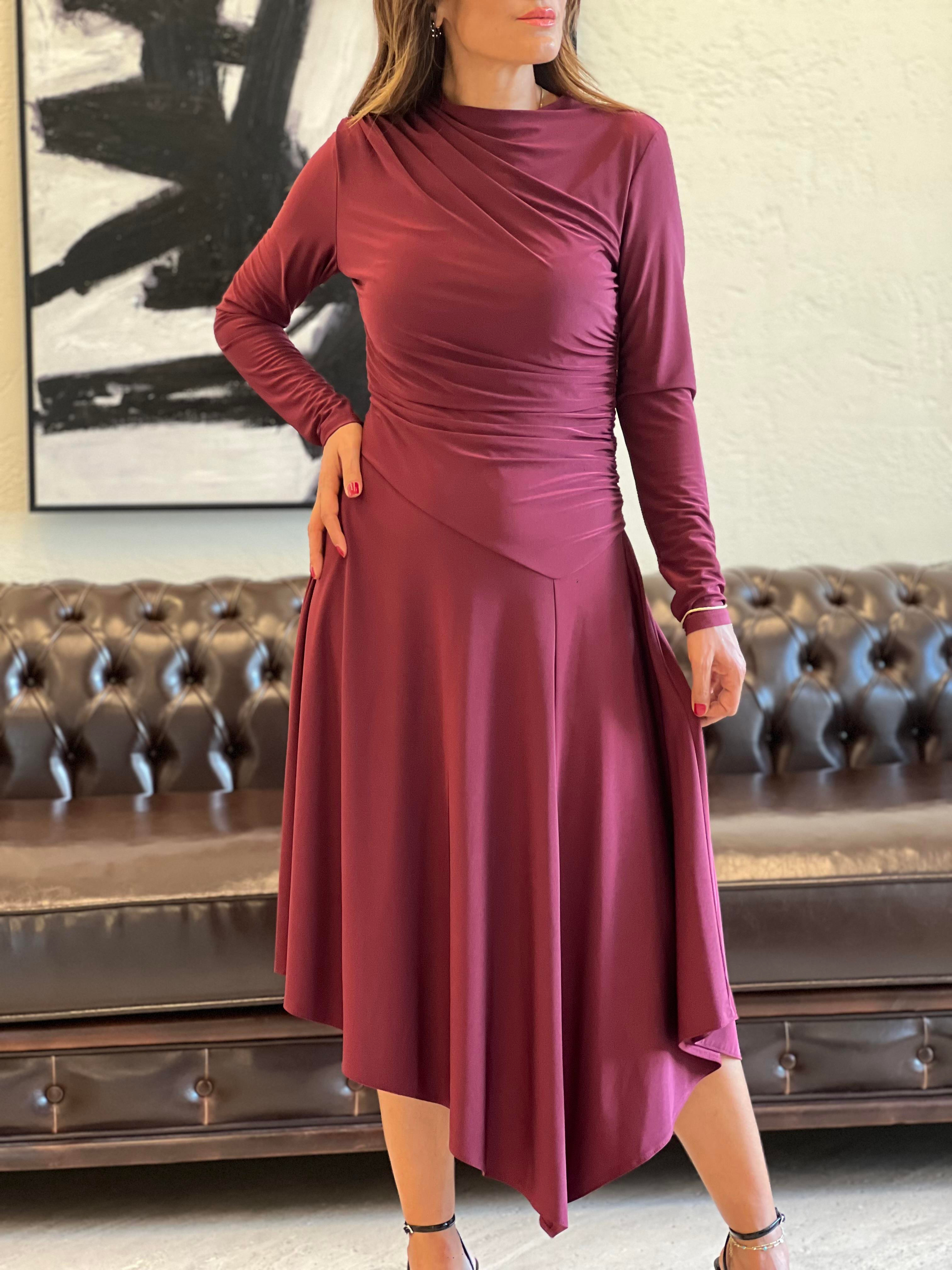 OMUZ VE BEL PİLE MODELLİ, SATEN KUMAŞ, UZUN KOLLU ELBİSE.