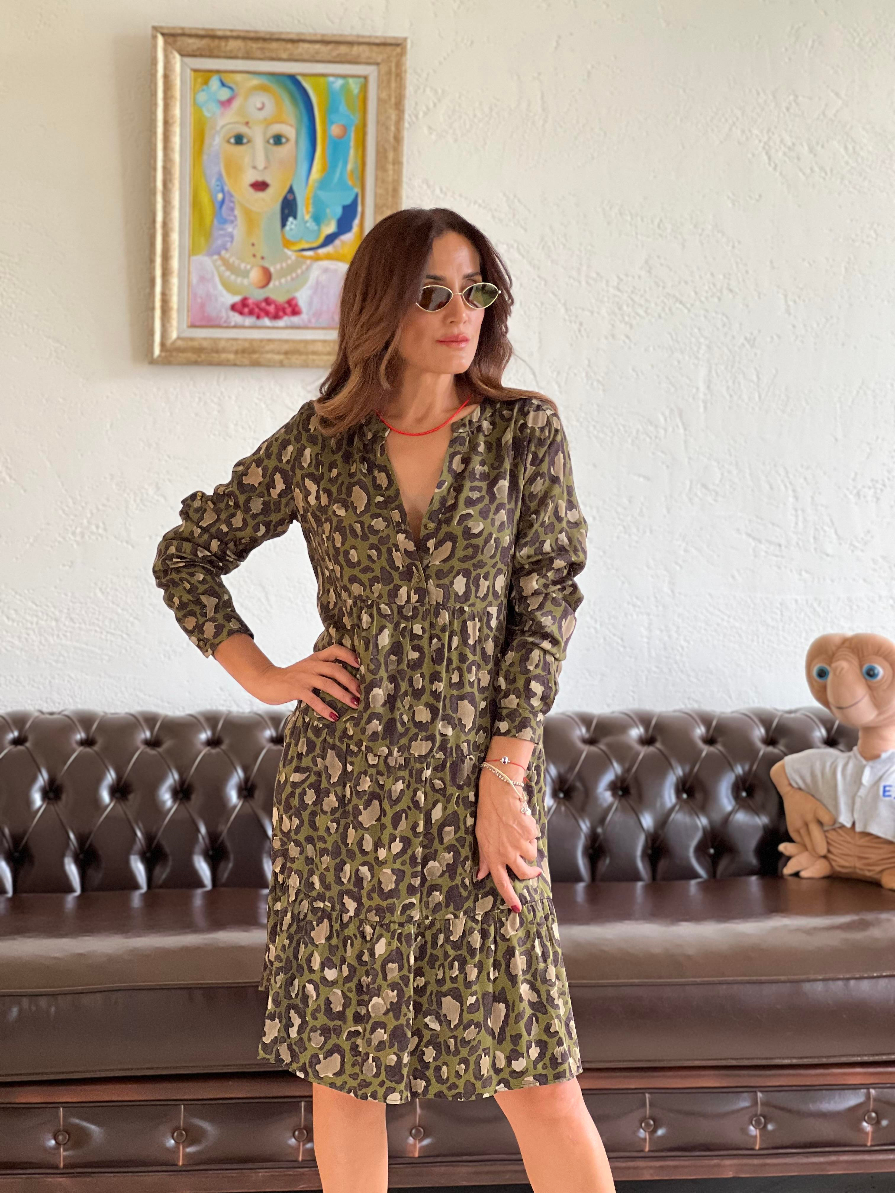 YEŞİL DESENLİ PİLELİ ELBİSE