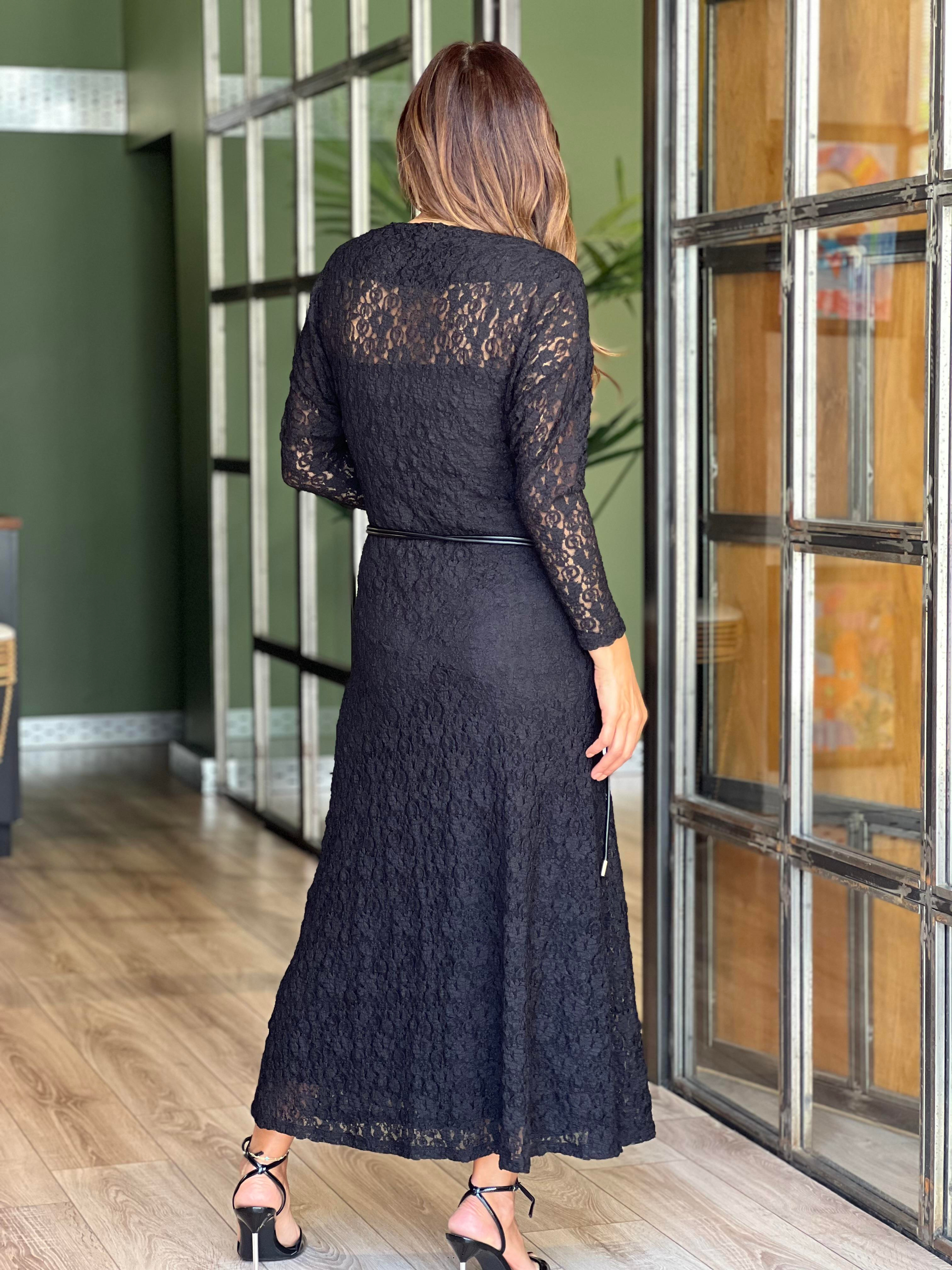 İÇ ASTARLI ,GÜPÜR ,BEL BÜZGÜ DETAYLI YARASA KOL , KEMERLİ ELBİSE