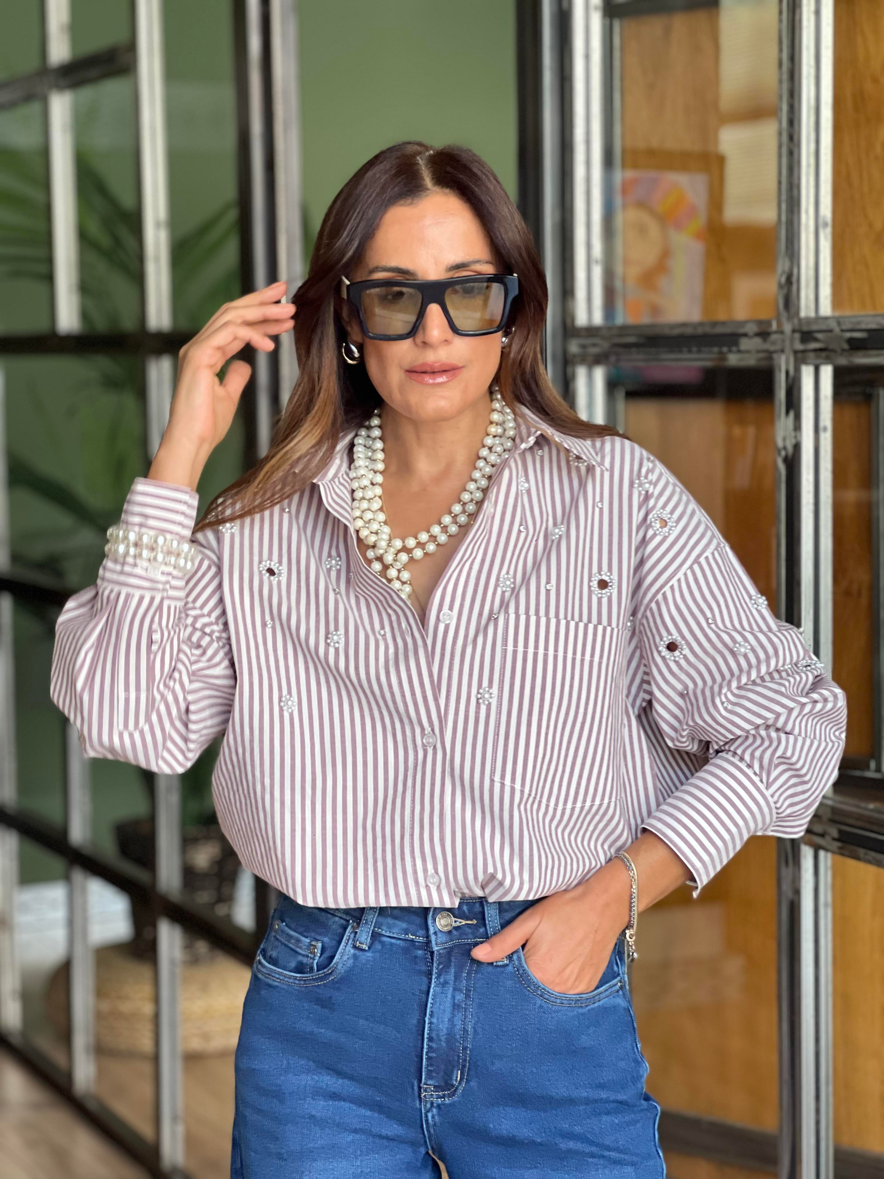 BOL KESİM ÇİZGİLİ ,TAŞLI PAMUK GÖMLEK