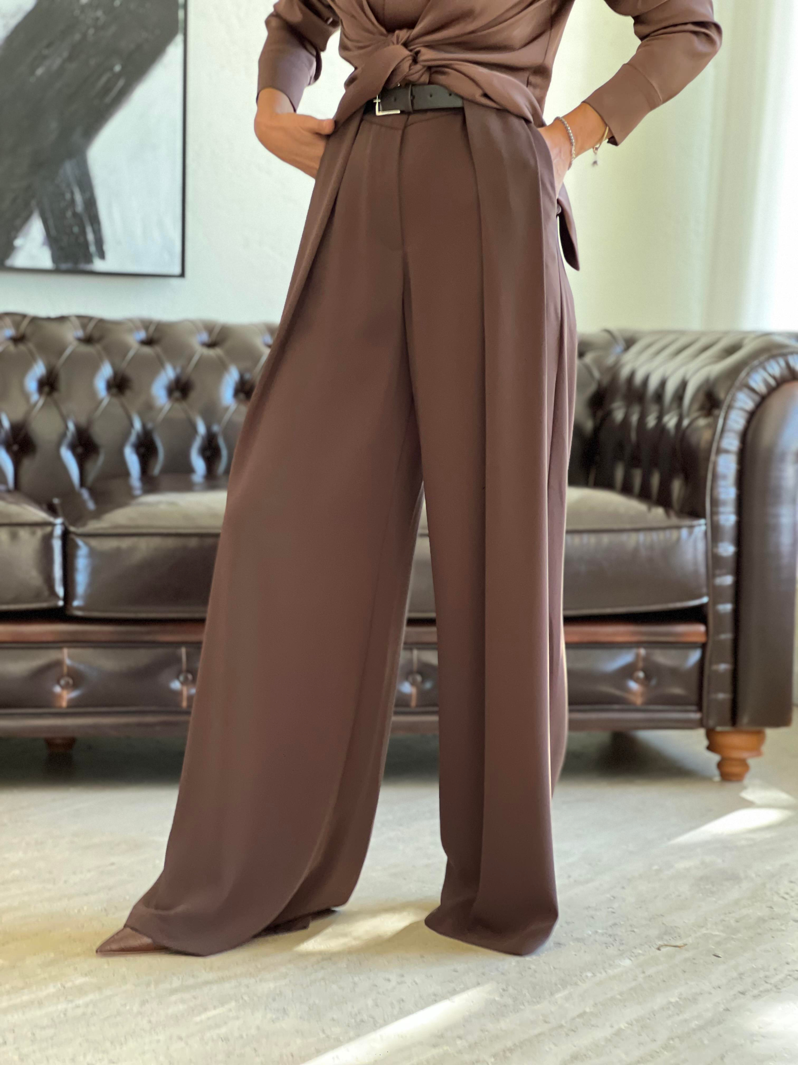 BEL KEMER DE PİLE DETAYLI DOKUMA KUMAŞ PALAZZO PANTOLON