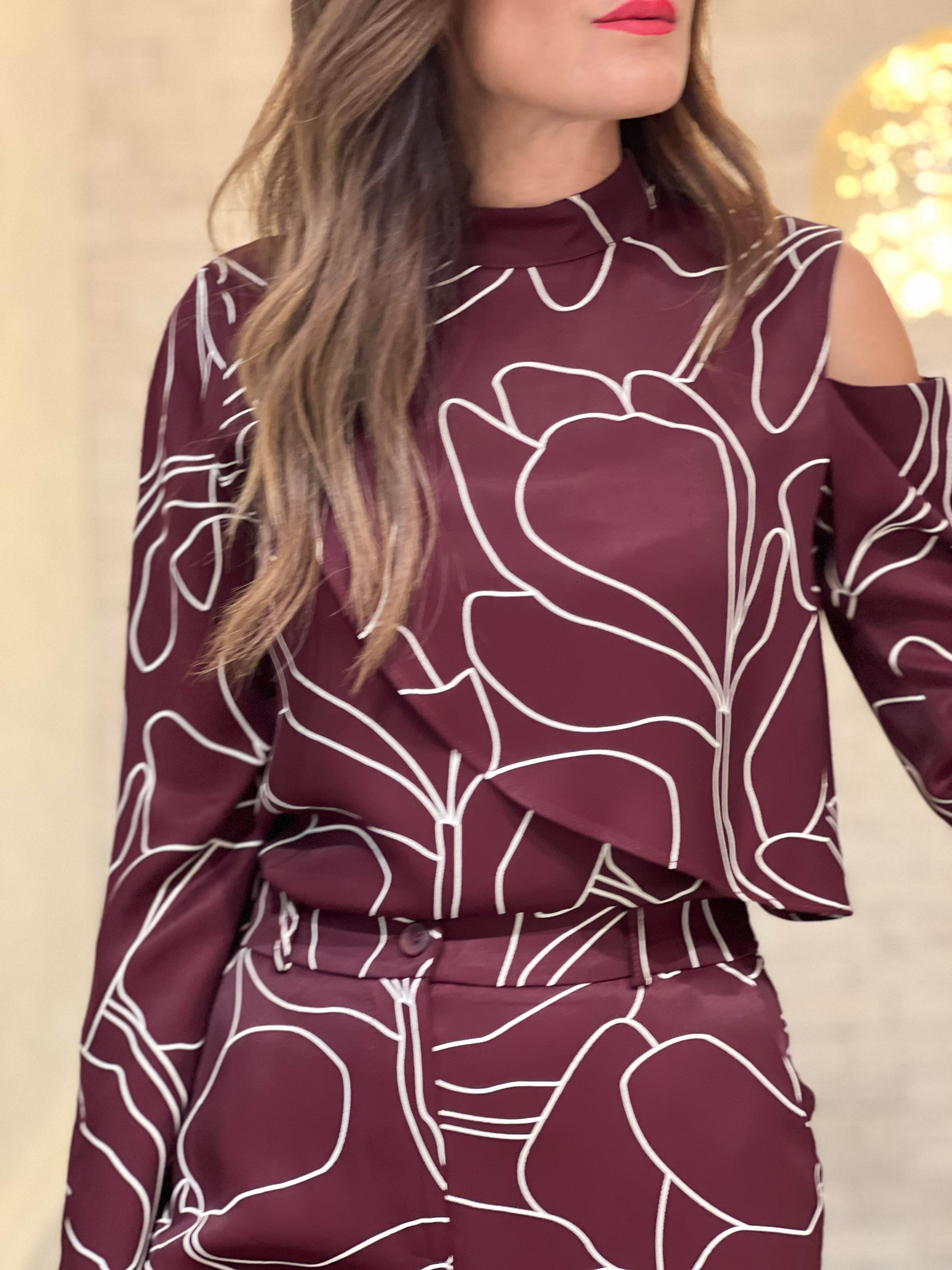 BORDO, SATEN KUMAŞ, BLUZ KOL PENCERE DETAYLI TAKIM